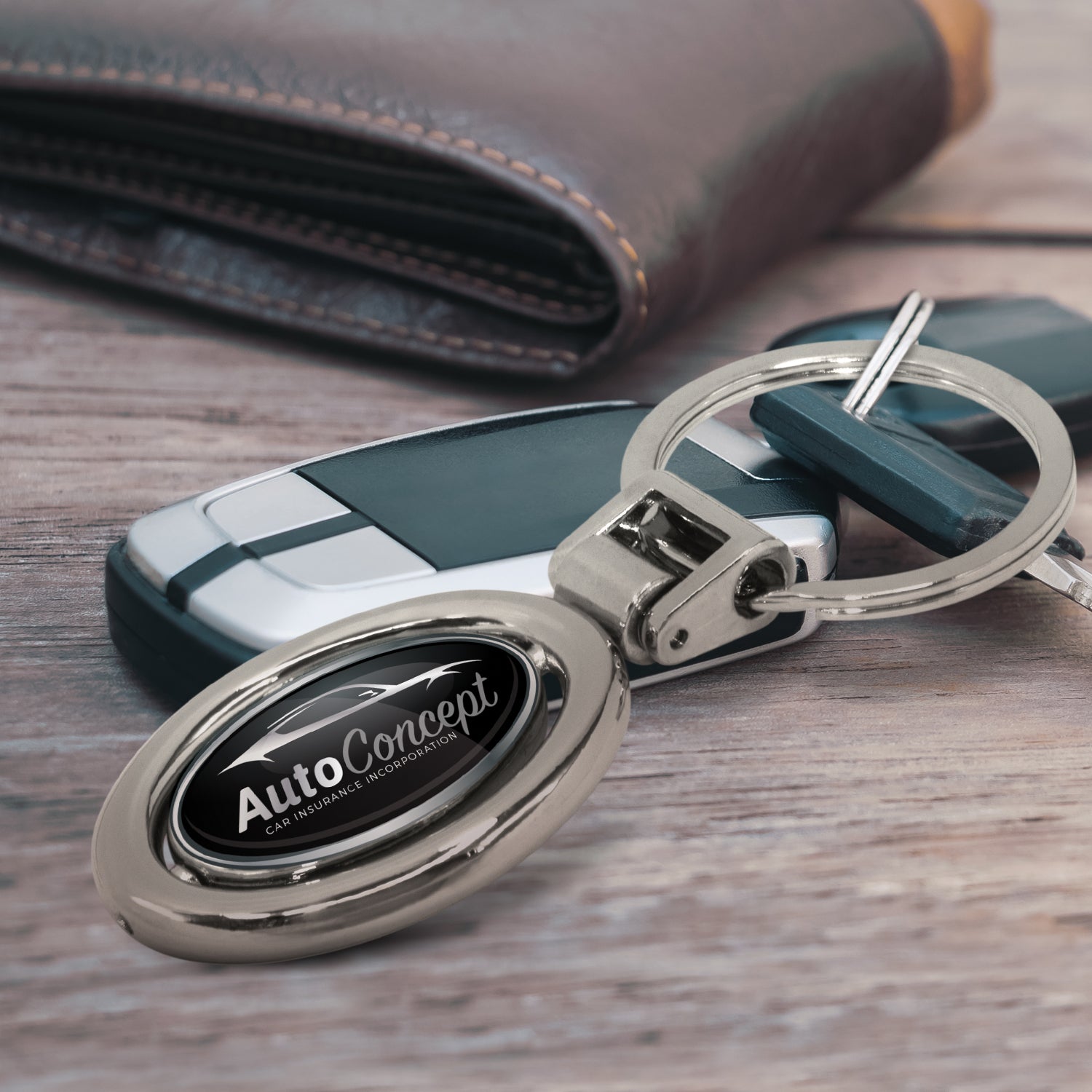 Oval metal key ring with a plated shiny chrome finish and an inner part that spins. The inner spinning part is branded on both sides with a resin coated finish and it is nicely presented in a black gift box.