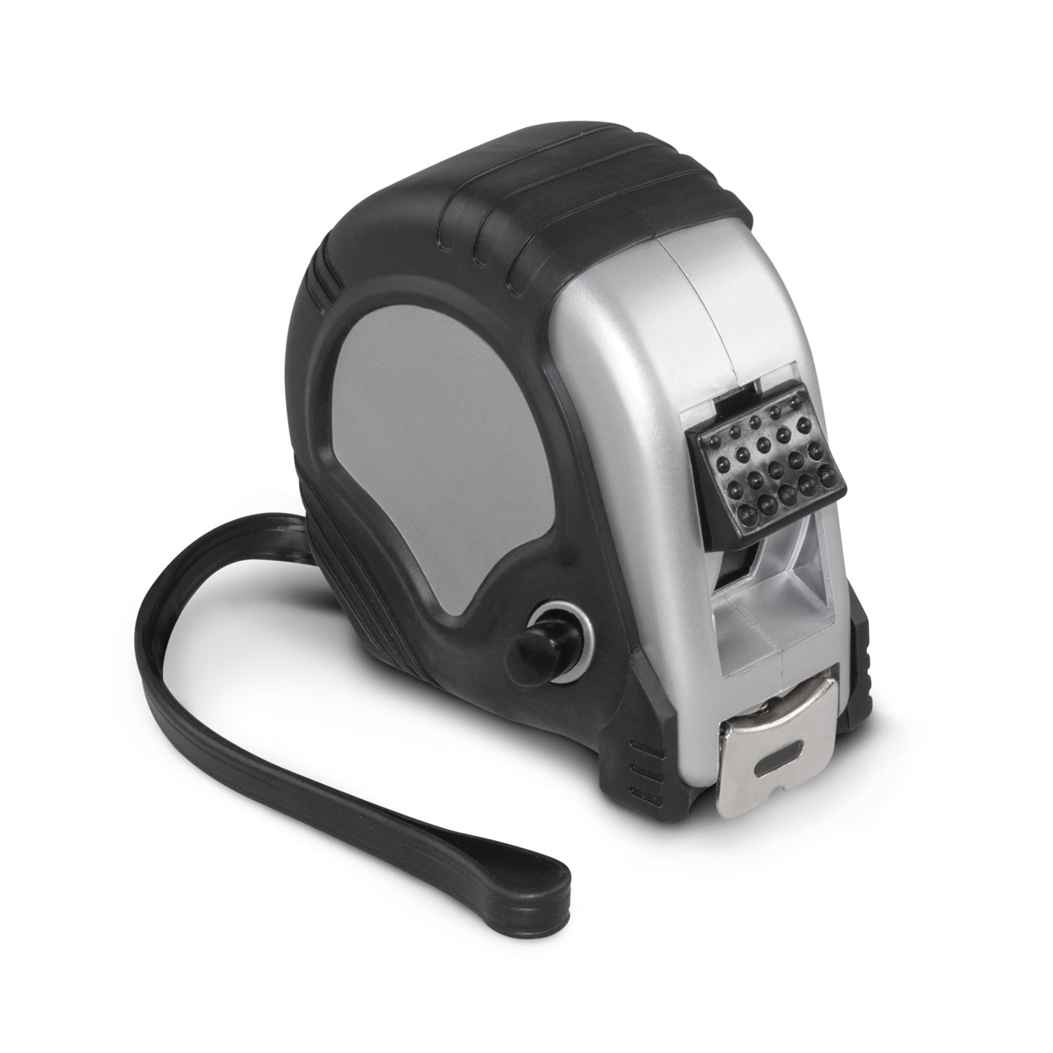 Locking tape measure with a tough impact-resistant rubber outer case and a 5m metal tape featuring both inches and centimetres. It also has a belt clip and a wrist strap.