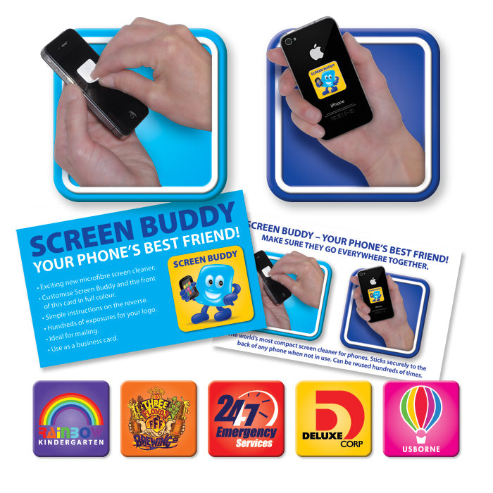 Screen Buddy is your phone's best friend. This compact mini screen cleaner has a microfibre cleaning surface and a resilient adhesive backing that remains sticky for hundreds of uses. It sticks securely to the back of a phone when not in use and is presented on a business card with simple instructions on the reverse. The front of the card and the Screen Buddy can be branded in spot colours or full colour at no extra cost. Special sizes and shapes for Screen Buddy and the card are available on request. A production lead time of 20 working days applies to this product by airfreight and larger orders can be sea freighted on request to reduce the freight cost.