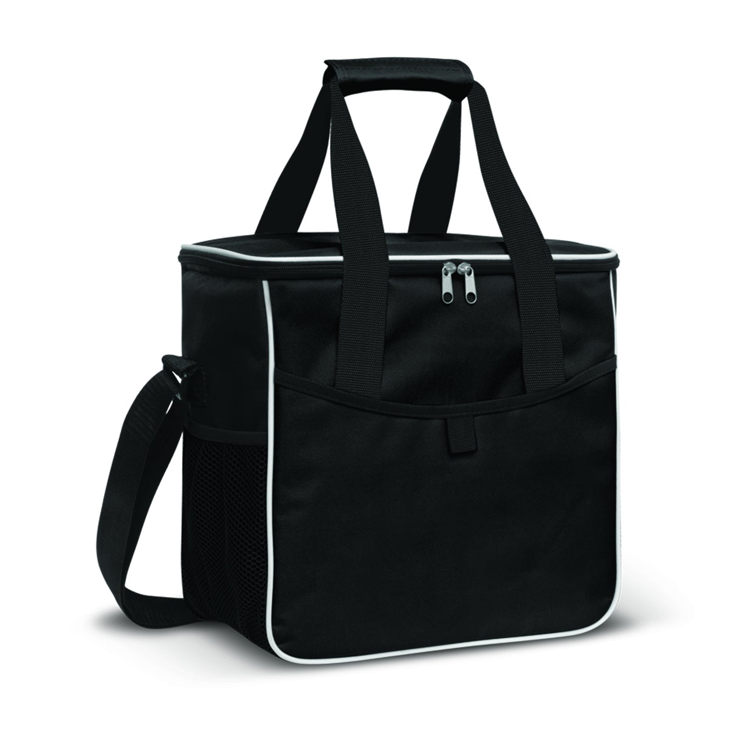 Impressive large 18L cooler bag with thick PE foam insulation encased in a water-resistant PEVA inner liner. The outer construction is 600D polyester with a large front slip pocket and two mesh side pockets. Other features include a zippered top closure, an adjustable woven shoulder strap and woven carry handles with a Velcro cuff.