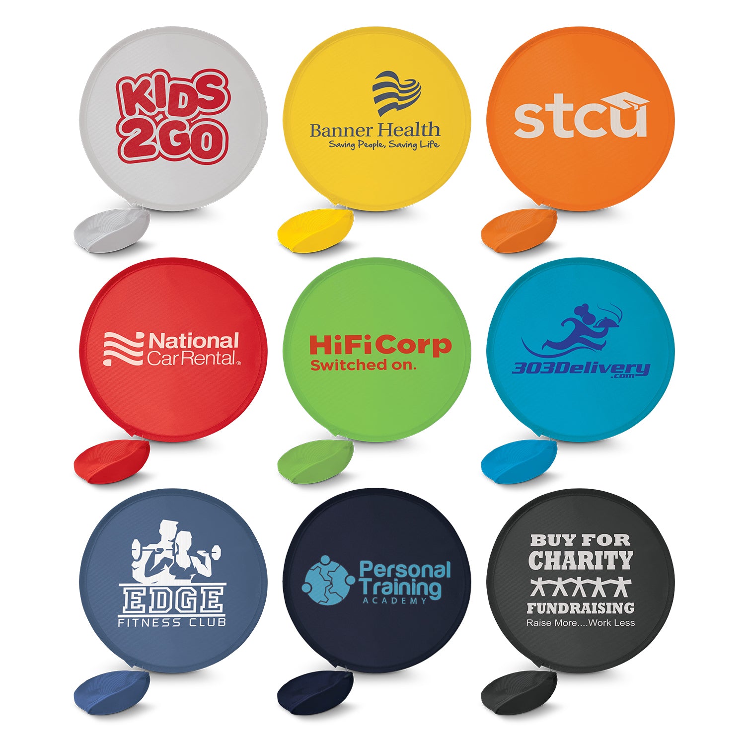 Inexpensive giveaway product which can be used as a fan. It has a high tensile internal wire frame and is supplied flat, ready for use with a handy storage pouch.