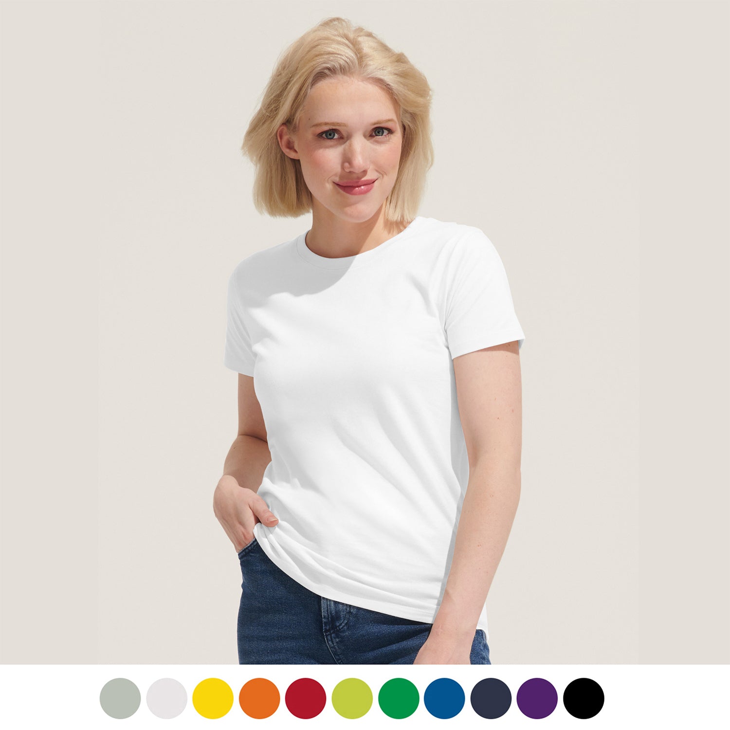 Stylish cut and sewn women's t-shirt which features an elastane ribbed round collar with neck tape reinforcing and short sleeves. It is available in five sizes and is manufactured from 190gsm heavy jersey, semi combed ring spun cotton. This gives the garment a soft and smooth feel as well as providing an excellent branding surface.