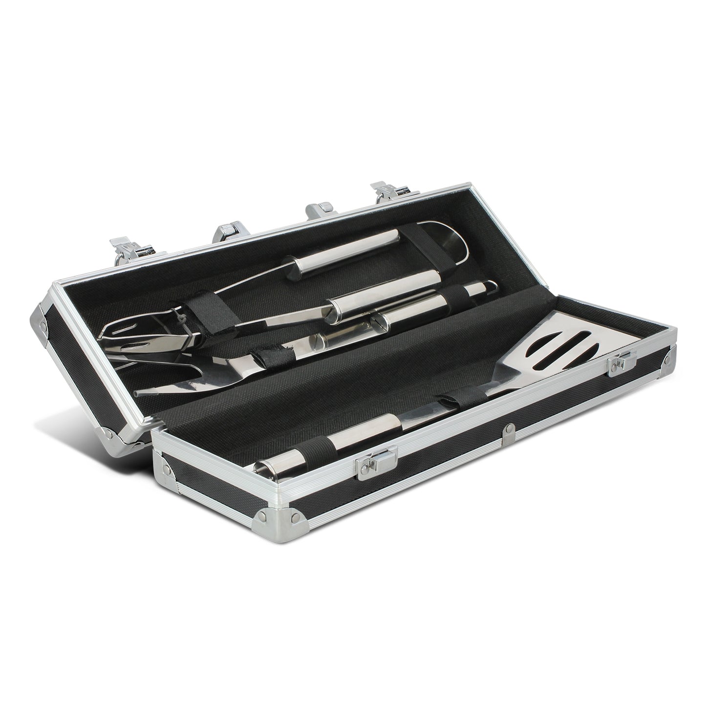 Handy barbeque gift set in a smart metal and plastic presentation case with a metal plate for branding. It includes a fork, a pair of tongs and a spatula, all of which are manufactured from non-stick food-grade stainless steel. The metal plate on the case laser engraves to an oxidised white colour. Product is presented in a metal and plastic case.
