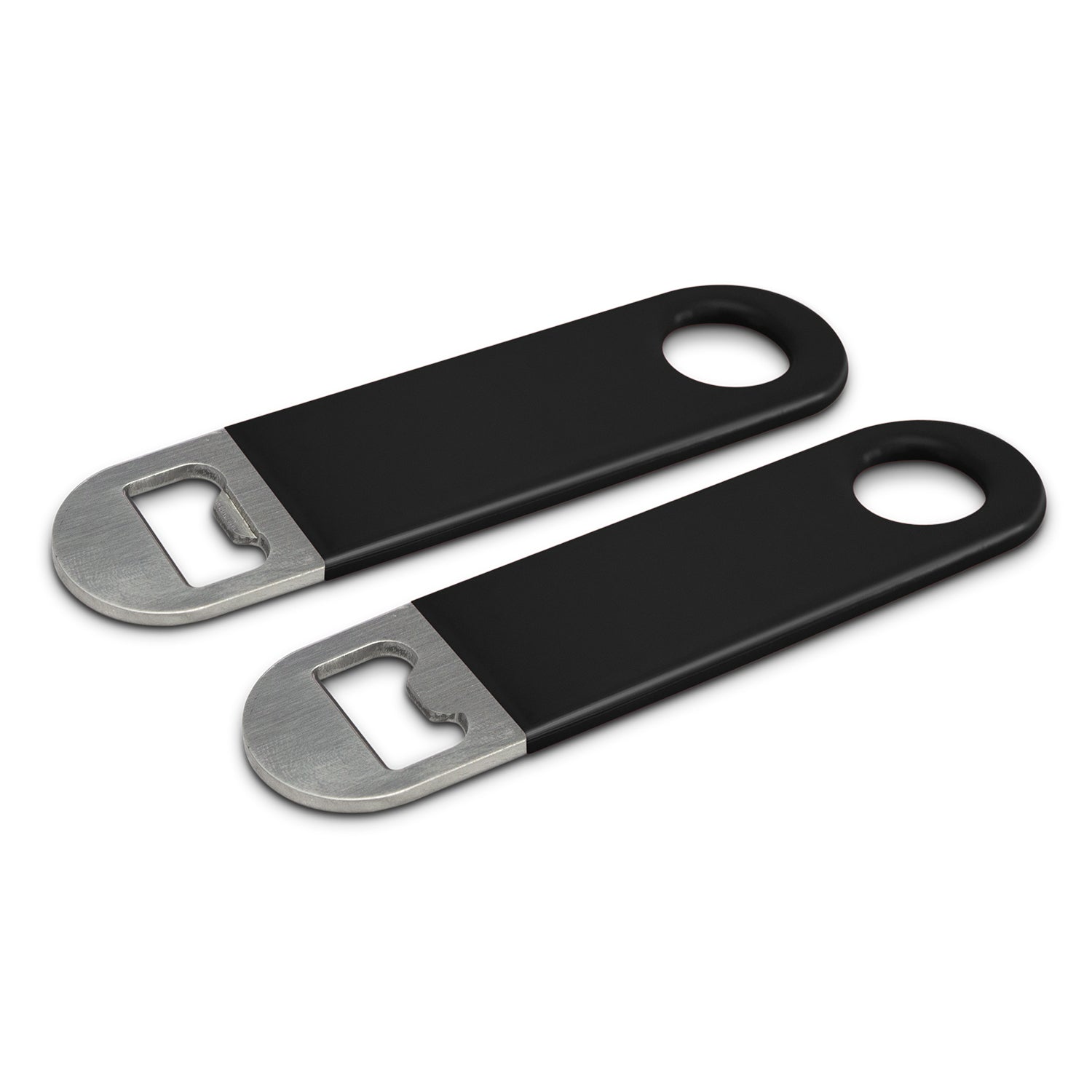 Small stainless steel bottle opener with a soft-touch vinyl coating.