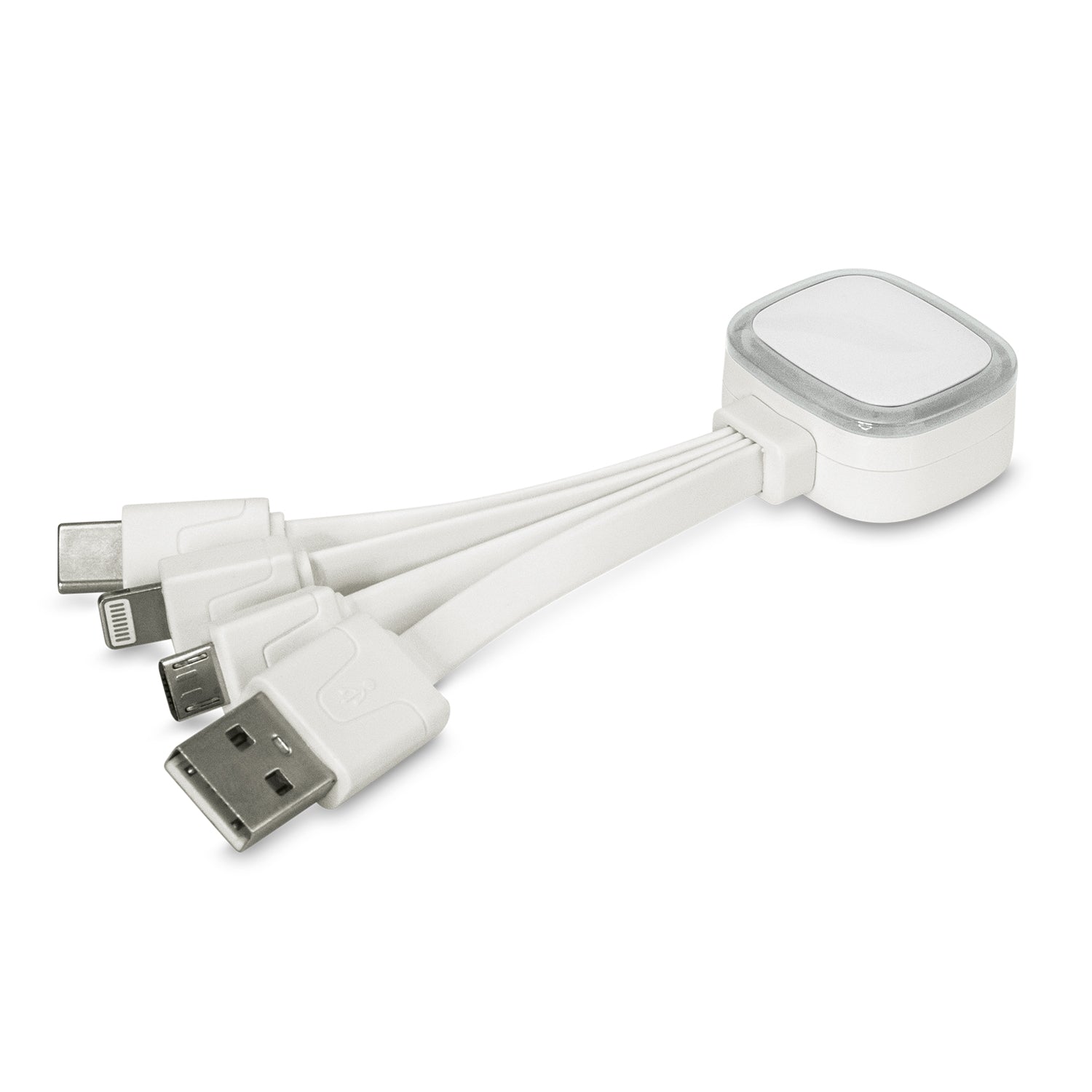 Trendy mobile charging cable which can be used to charge most phones. It has a translucent LED insert that lights up when it is in use and four different connectors. Zodiac has a USB connector cable, a Micro-B connector, a Lightning connector and a USB Type-C connector. This device is for charging only and is not designed for data connections. It can be customised with full colour branding and the choice of seven different coloured translucent inserts.