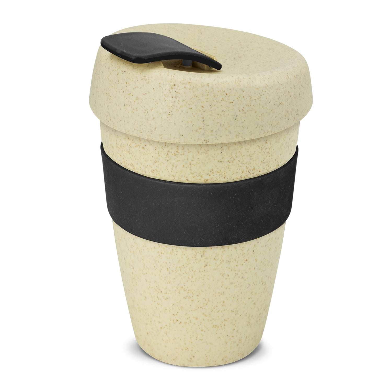 Unique 340ml double wall reusable coffee cup which will keep drinks hot for longer and remain comfortable to hold. It is manufactured from a 50/50 blend of natural rice husk fibre and BPA-free polypropylene. It has a decorative silicone band and a secure screw on lid with a splashproof flip closure. The silicone band and flip closure can be mixed and matched in any colour combination from the standard colours at no extra cost. Up to five different colour combinations are included in the price and more are available for an additional charge. An optional natural gift box is available on request. This product is not dishwasher safe and handwashing is recommended. Express Cup - Double Wall Natural is protected under New Zealand Design Registration No. 419451 and Australian Design Registration No. 361937.