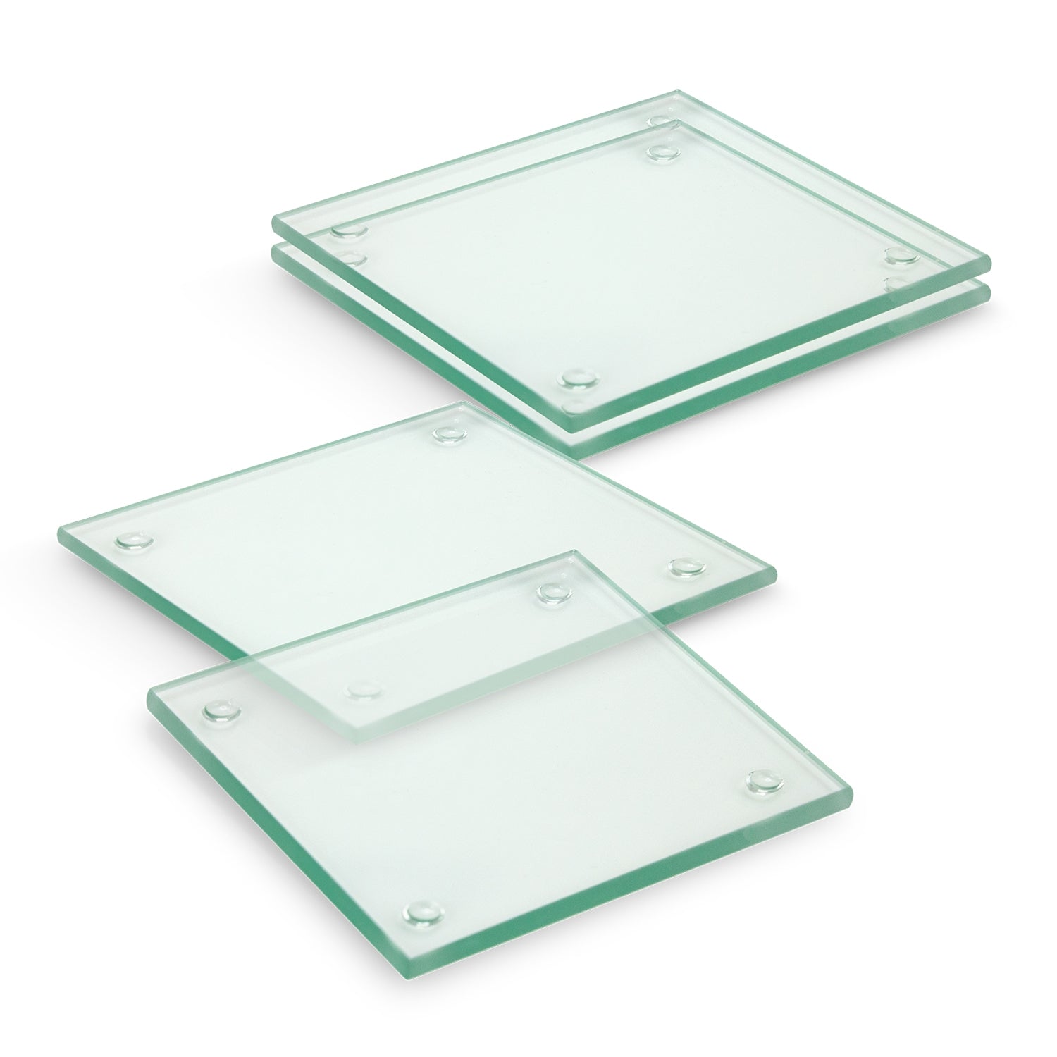 Set of four square glass coasters in an elegant black gift box with a window to show off the brand. The coasters have four non-marking polyurethane pads on the base. Handwashing is recommended.