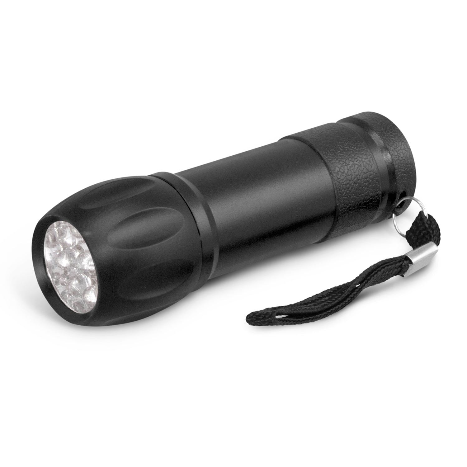 Compact torch with nine powerful LEDs and a woven strap. It is powered by three AAA batteries which are included.
