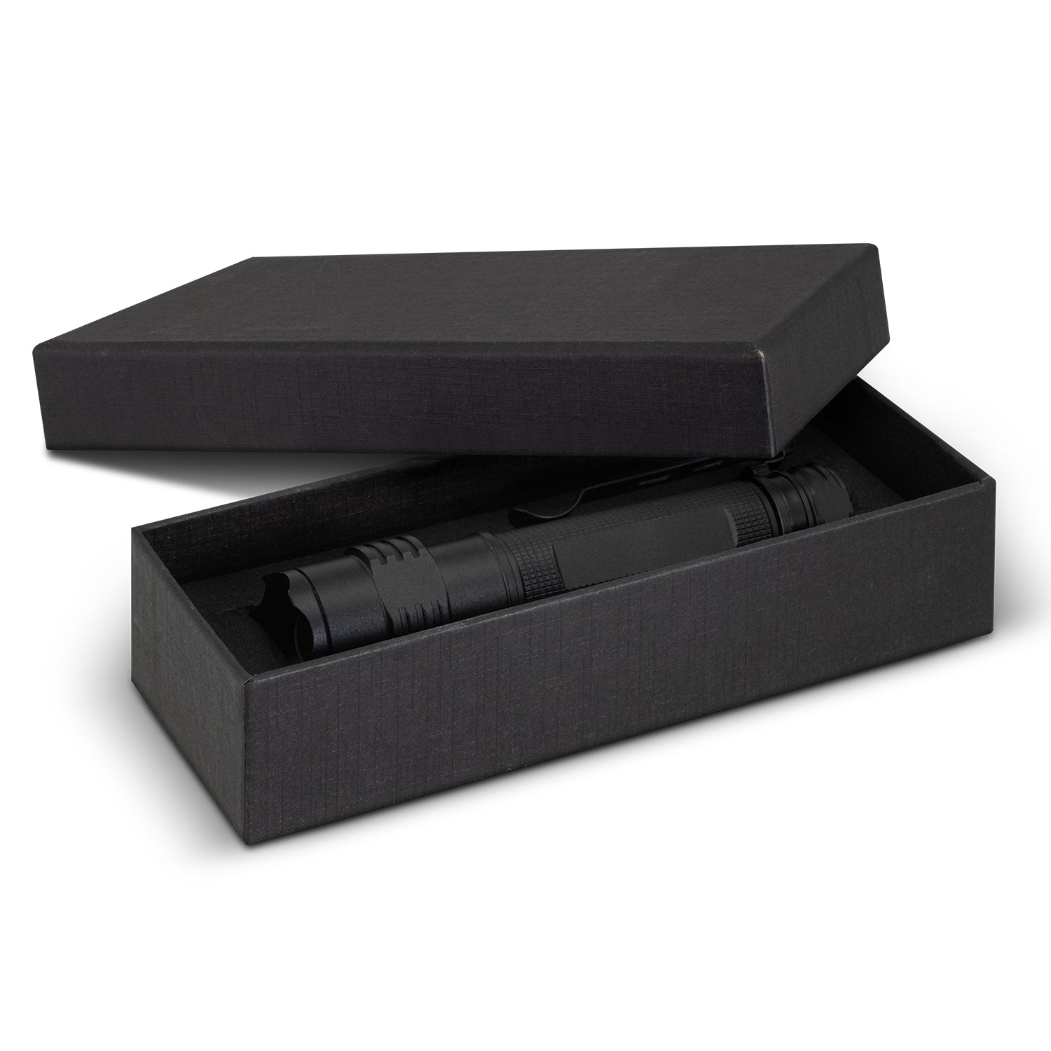 Large 3W metal torch with an adjustable beam which is fitted with bright LEDs. It has a belt clip and is equipped with a 1200mAh rechargeable battery. The torch comes with a USB cord to enable recharging. The torch laser engraves to an oxidised white colour, and it is presented in a black gift box.