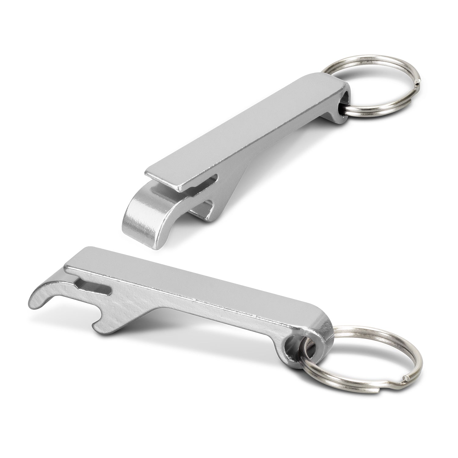 A versatile promotional product, this aluminium bottle opener has a key ring and can also be used to open drink cans.