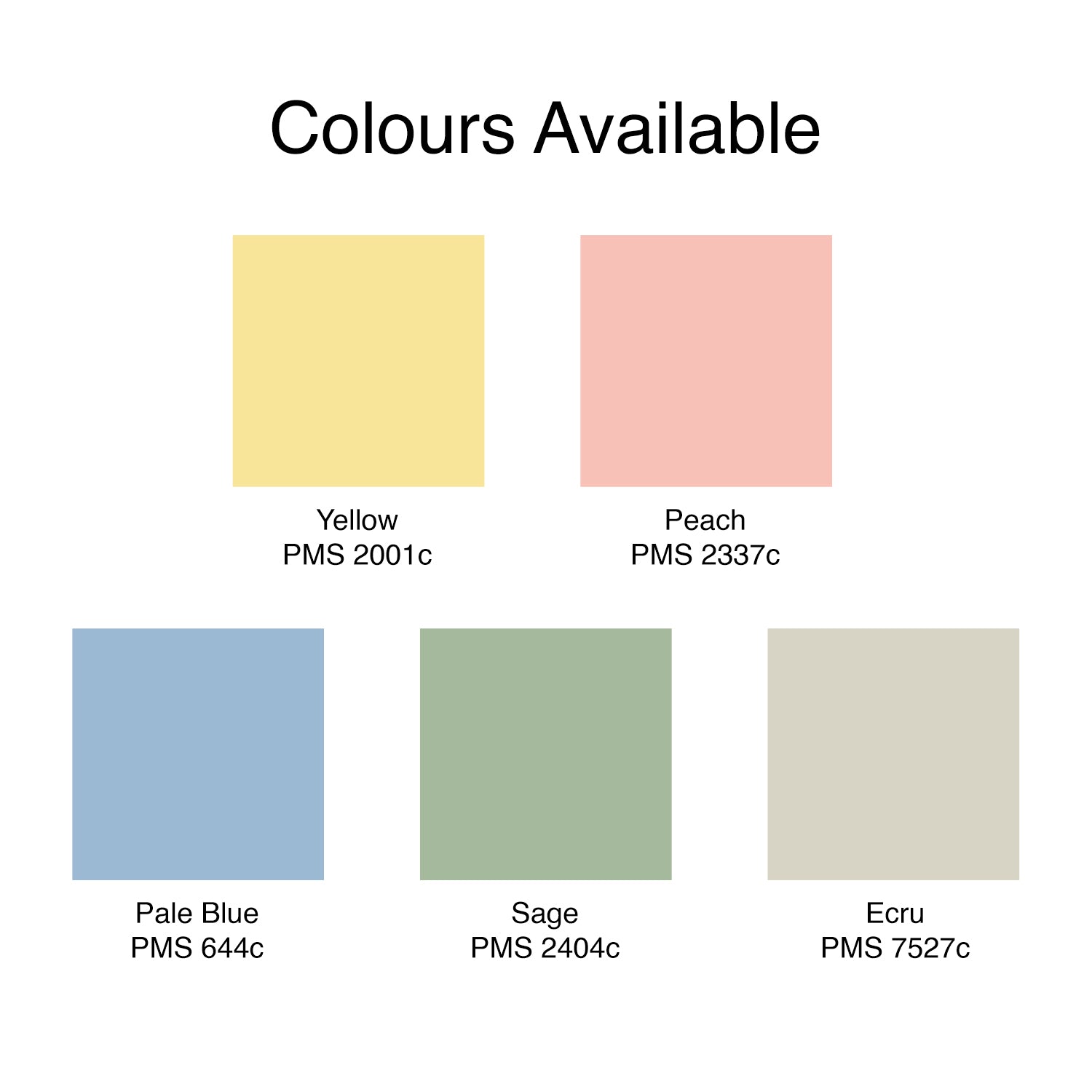 Ecru, Yellow, Peach, Sage, Pale Blue.