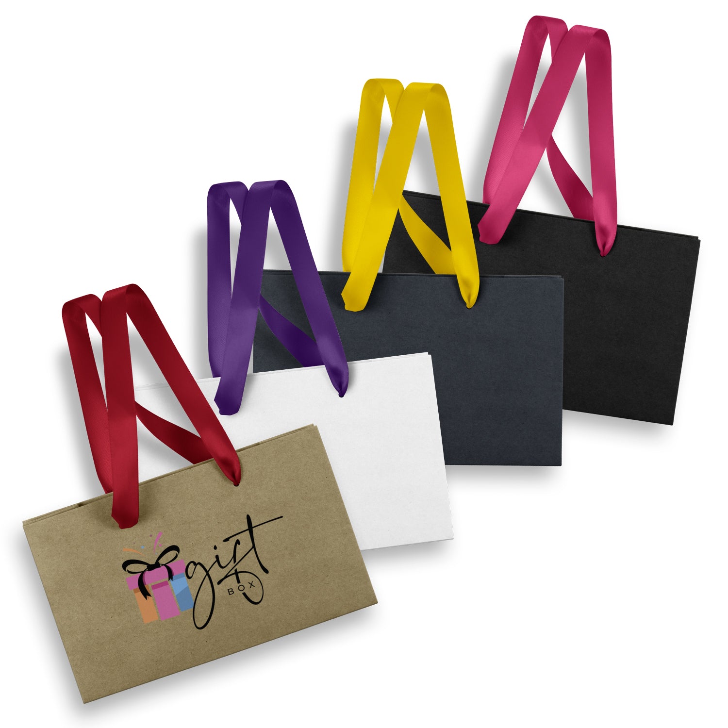 Small carry bag made from 180gsm paper with coloured ribbon handles. The gusset and top edge are reinforced for added strength.