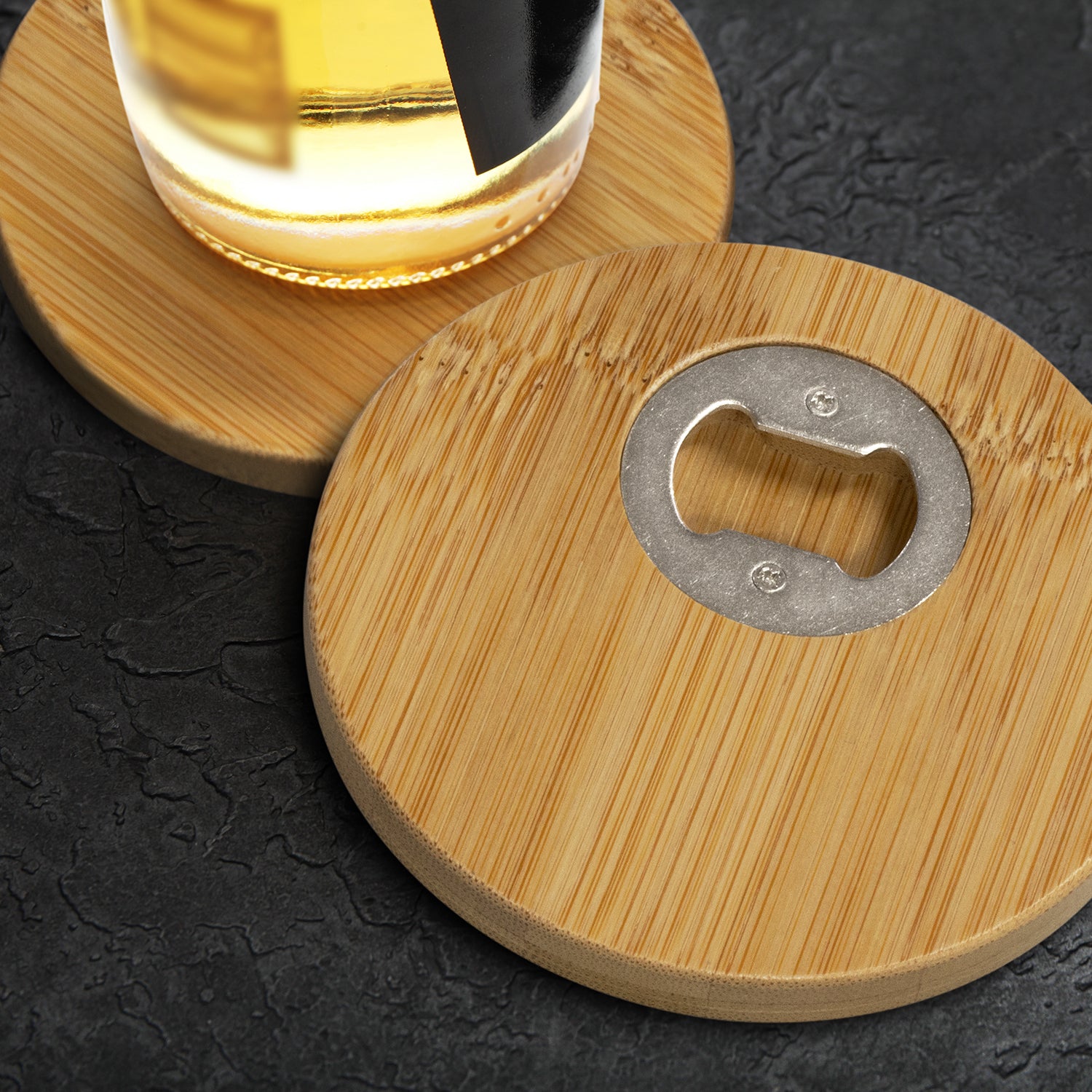 Set of two round coasters made from natural bamboo. The coasters have a smooth bamboo surface with an iron bottle opener built into the underside. The set is presented in a natural gift box.