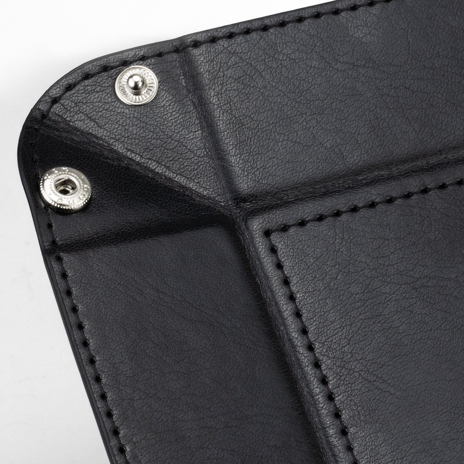 Compact valet tray made from stylish leather-look PU. This versatile tray easily collapses and can be reconstructed using snap fasteners, and is ideal for holding keys, trinkets or playing dice games.